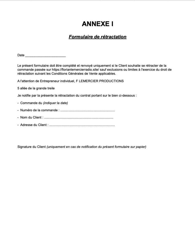 Le Client peut exercer son droit de rétractation en envoyant une lettre ou un email au Vendeur, indiquant la décision de rétractation. Les produits doivent être retournés dans leur état neuf, à l'adresse du Vendeur, dans un délai de 14 jours suivant l'exercice du droit de rétractation.